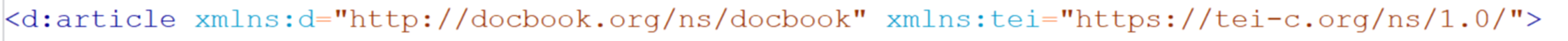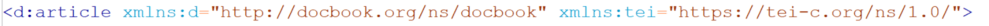 If you use two namespaces, you need to declare both namespaces on your root element. Let’s keep working with the DocBook article template that you just opened. What if you wanted to introduce a TEI element into an XML article that is otherwise encoded in DocBook’s markup language?