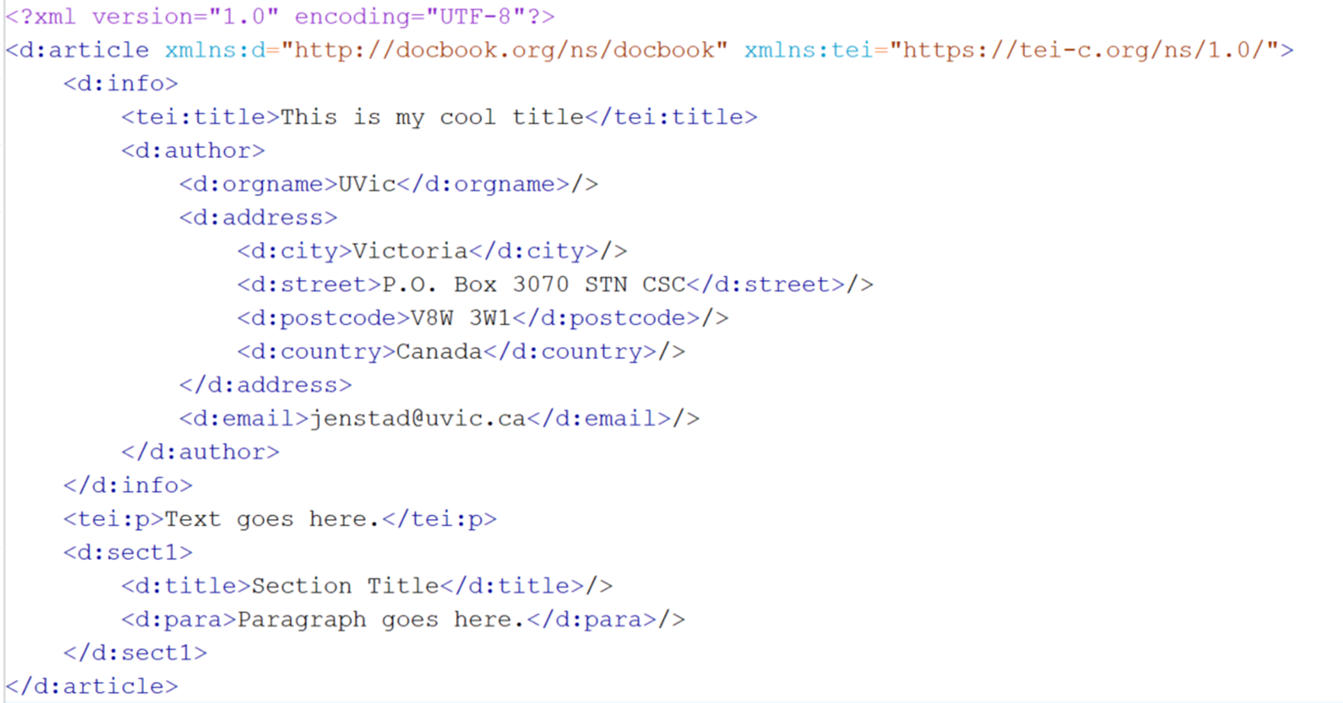 Can you guess why my root element is now <d:article>? Answer: Because once I’ve started using two namespaces in my document, I have to add that prefix even to my root element.